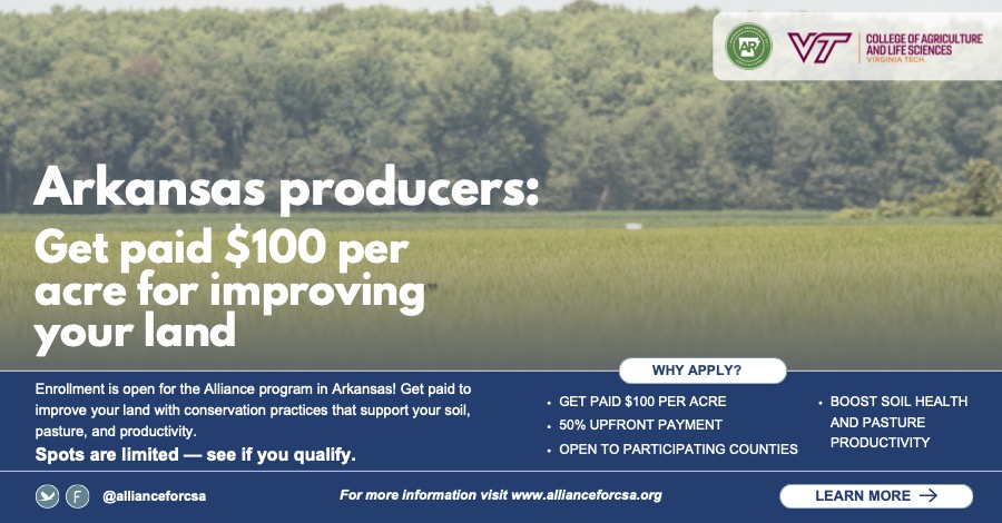 Arkansas producers: Get paid $100 per acre for improving your land For 2026, enrollment in Arkansas is open to producers who are new to the Alliance. Read More » April 9, 2026 No Comments